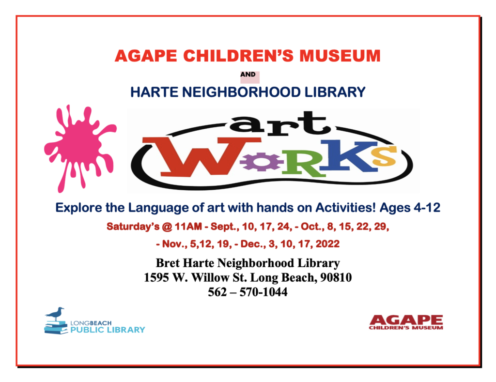 Though a creative collaboration between Agape Children’s Museum and Long Beach Public Library, Bret Harte Neighborhood library will host an Art Works Workshop event that will take place at 11:00 […]